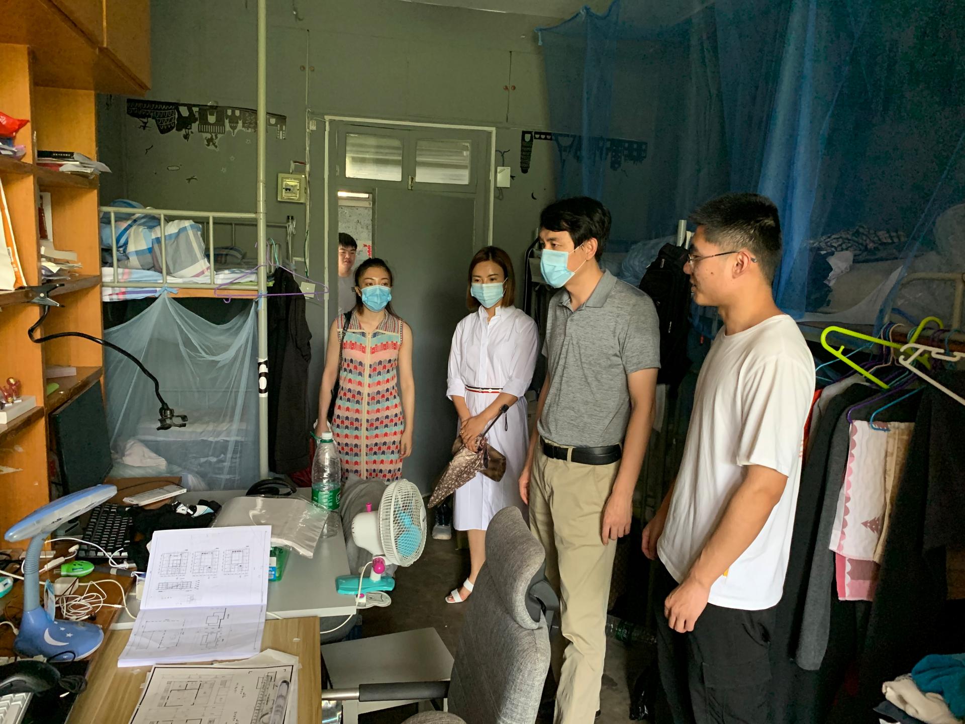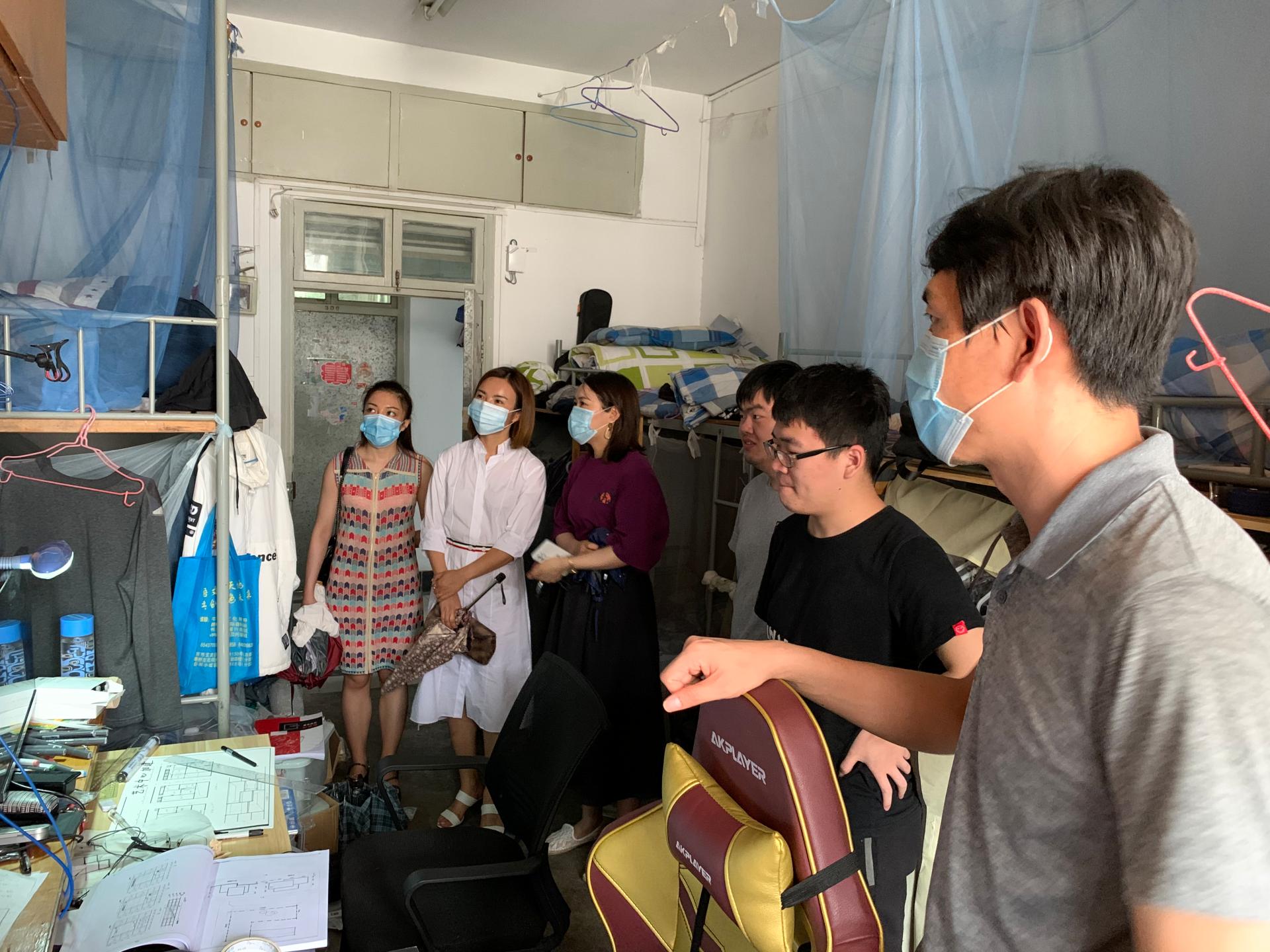 2020年7月10日,建筑公司党委副书记徐源、员工事务办公室主任林宁、院团委副书记张清扬、辅导员管苏、王伟杰等老师,来到江浦校区员工宿舍,看望了暑假期间留校住宿的同学,为他们送上了亲切的关怀。