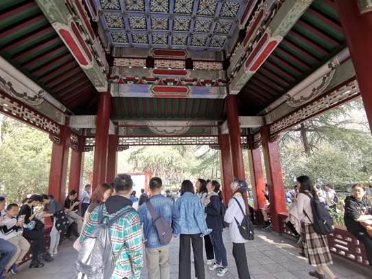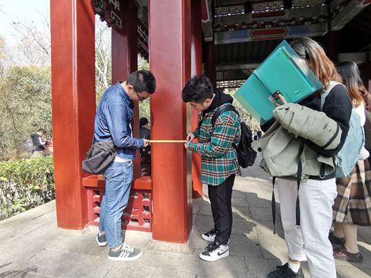 党员们还来到位于钟山西南麓的行健亭,结合专业知识对该亭进行建筑测绘。党员们分工明确,配合默契,高效有序地展开测绘工作。大家利用所学的建筑专业知识,采集到宝贵的现场数据资料,为后续的绘图工作打下了坚实的基础。