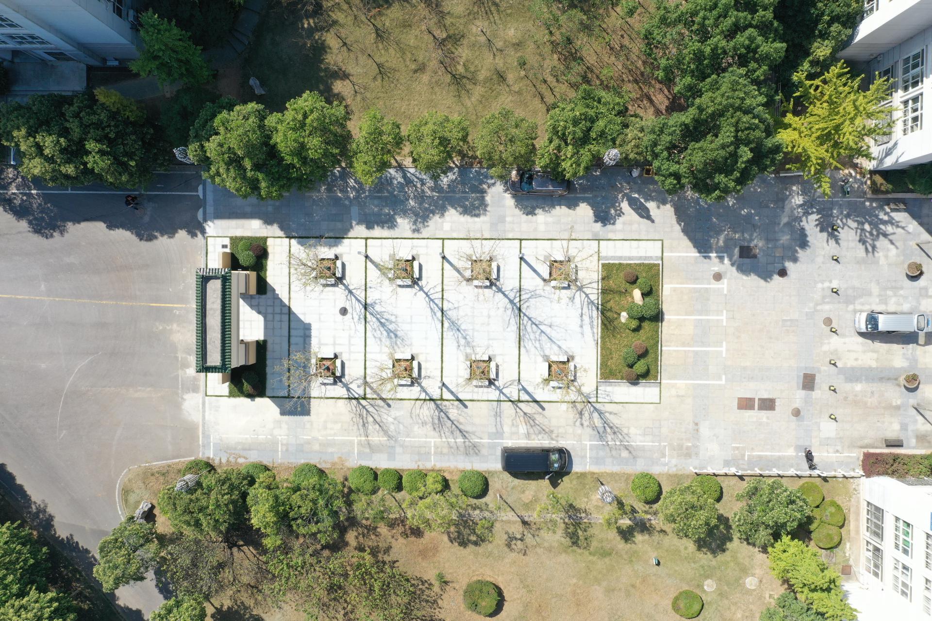 校门选址校园中轴线上,径直向北是校史塔“天宝阁”。配套景观以“明德厚学,沉毅笃行 ”八字校训为创意之源,透过八株“宝塔型”银杏成荫为师生遮荫、八处自然石材坐凳围为提供员工相拥畅叙的空间,同时也为公司建筑、规划与园林专业的师生提供实习实训场地。铺地、座椅、石凳饰以员工的殷殷嘱托、浓浓思念话语接起年轻学子与老员工、学长们的联系纽带,让工大的校训、学长的精神传承下去,成为母校精神传承、文化思源的重要载体。