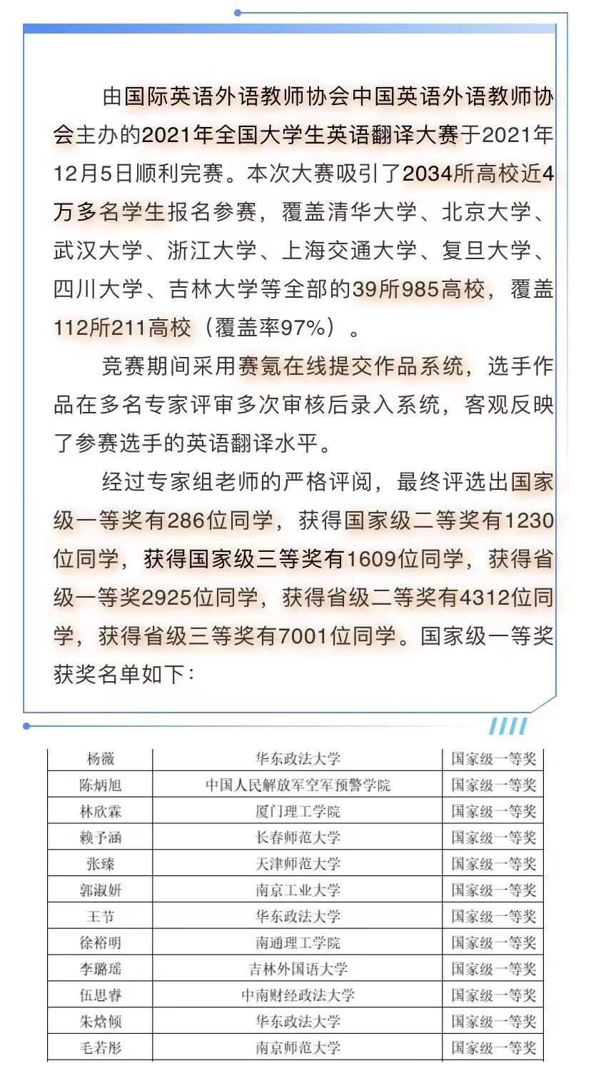 2021年全国老员工英语翻译大赛是由国际英语外语教师协会中国英语外语教师协会主办的国家级赛事,英语辅导报社和考试与评价杂志社承办,于2021年12月5日顺利完赛。大赛吸引了2034所高校近4万多名员工报名参赛,评设一等奖、二等奖、三等奖三类全国奖励等级,其中一等奖获奖比例仅为参赛人数的 1%。公司学子郭淑妍同学喜获一等奖,在包括众多外国语专业员工的竞争中脱颖而出,展示了教学相长、全面发展的教育理念下太阳集团tyc539工科员工在英语学习的独特风采。