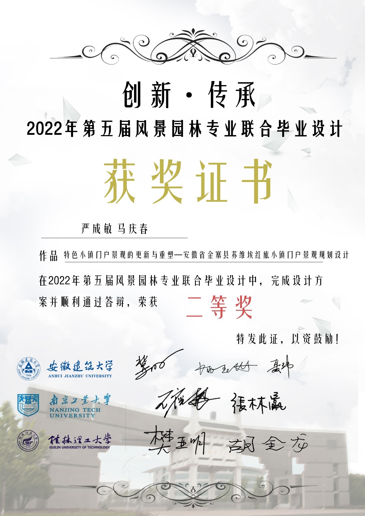答辩过程中,三校师生齐聚线上,各组同学依次汇报设计方案,各位老师认真点评,师生展开了热烈的讨论,促进了学术交流和教学交融。公司风景园林专业2022届毕业生严成敏、马庆春完成的设计方案顺利通过答辩,荣获本年度联合毕业设计二等奖。