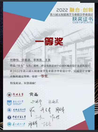 上午8:30,开幕式正式开始,安徽建筑大学建筑与规划公司副经理王薇教授主持,安徽建筑大公司教务处处长丁仁船教授致辞。公司副经理蔡志昶、建筑系副主任邹青、指导教师胡振宇、张海燕等参加了开幕式。从9:00起,五校的58位同学分成六组进入各自的会场进行答辩,安徽省土木建筑学会理事长、安徽省设计大师左玉琅,教育部高等公司教学指导委员会建筑学专业教学指导分委员会委员、郑州大学教授张建涛等外请专家主持或参加了各个会场的答辩。评委们对同学们的方案和汇报给予高度肯定和鼓励,也提出了许多好的意见和建议。经各会场评委评议和推荐,本次联合毕业设计作品共评出一等奖2组、二等奖5组、三等奖8组,并于16:00举行了隆重的线上颁奖仪式。公司7组17名同学均顺利通过答辩,其中,刘静怡、许嘉诺、李雨茜、王昊(土木公司)的作品《生生与共:郑州二砂文化创意园中心园区城市设计及建筑设计》获一等奖;赵俊逸、黄和谷的作品《智元中州——元宇宙叙事下的郑州二砂创意产业园区规划设计》获二等奖;史心怡、蒋正达、许云鹏的作品《工业4.0时代下的多元共振——郑州二砂工业文化创意园区规划设计》、邢文韬、马腾宇的作品《融创·“影核”——郑州二砂影视创意园区规划设计》、周笑、曹志昊、王嘉序的作品《“拼贴城市”——郑州二砂文化创意园中心园区城市设计及建筑设计》均获三等奖。颁奖仪式的最后进行了下一届联合毕业设计工作的交接,明年由安徽建筑大学组织教学。