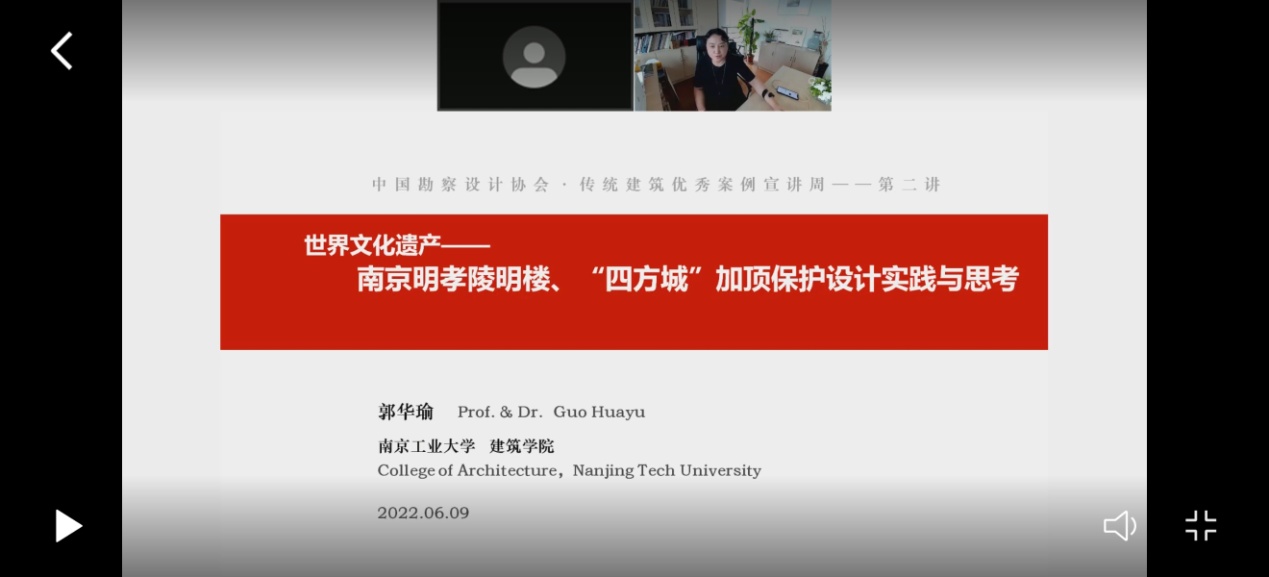 2022年6月9日,太阳集团tyc539经理郭华瑜教授受邀参加“传统建筑优秀案例宣讲周”并做主旨报告。本次学术活动由中国勘察设计协会传统建筑分会举办,邀请全国知名的传统建筑学者、设计院的总建筑师,就近年来创作的优秀传统建筑设计项目通过线上直播的形式进行分享。