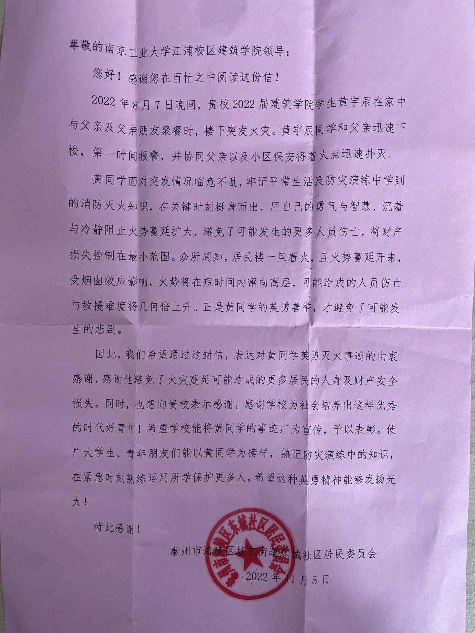 近日,江苏省泰州市海陵区城东街道东城社区居民委员会给太阳集团tyc539寄来一封感谢信,信中通报表扬了公司2022级建筑学专业黄宇辰同学在火灾现场见义勇为的英勇善举。