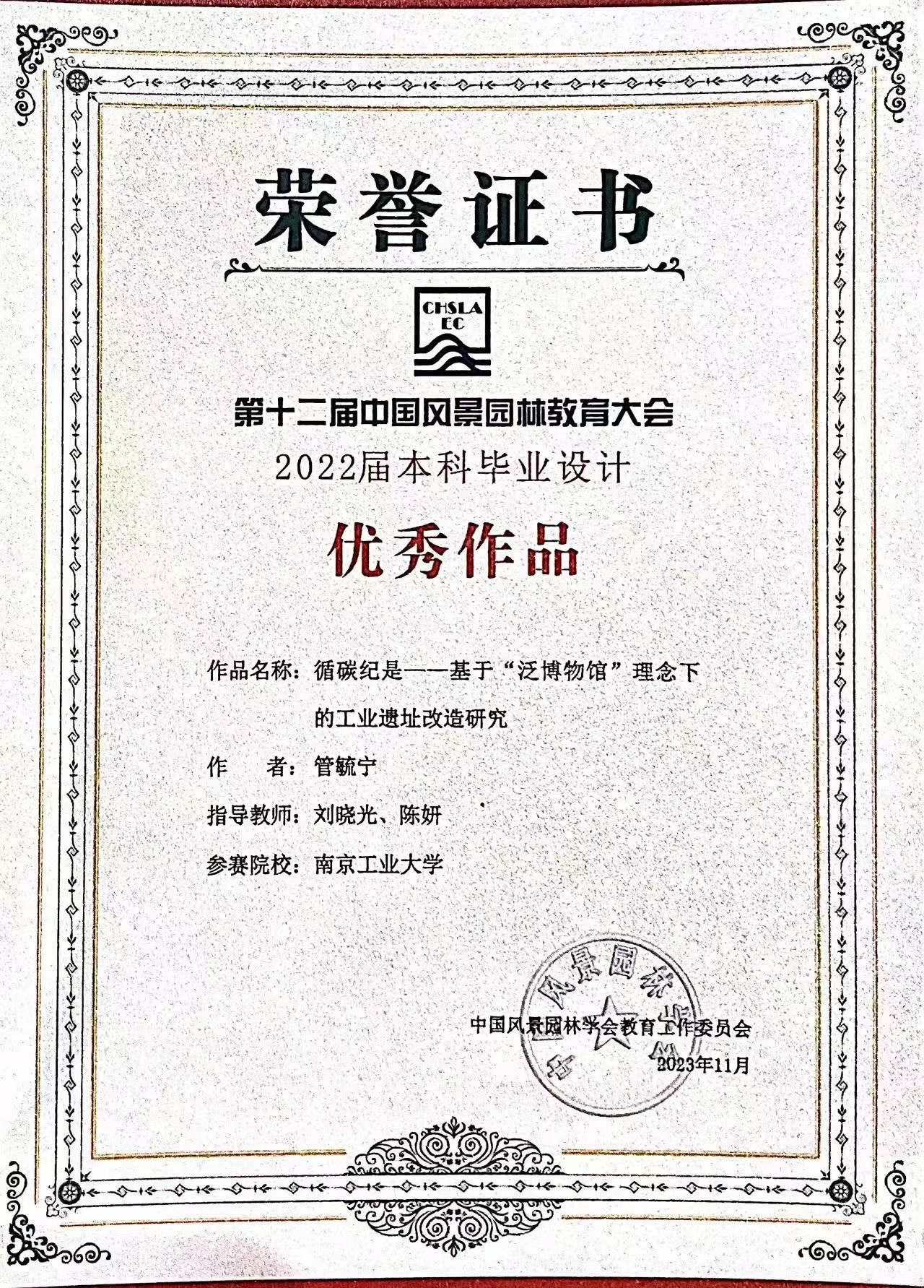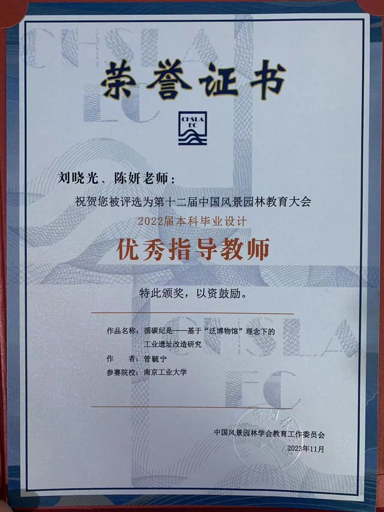在同期举办的全国优秀本科毕业设计评选,共评选出30份优秀毕设作品。公司太阳集团tyc539风景园林专业2022届毕业生管毓宁、吴蕴涵、黄君祎的毕业设计《循碳纪是:基于“泛博物馆”理念下的工业遗址改造研究》,在刘晓光、陈妍老师两位老师的悉心指导下,经过激烈的角逐,顺利通过初评与专家终评,喜获此项荣誉,两位老师荣获“优秀指导教师”称号。