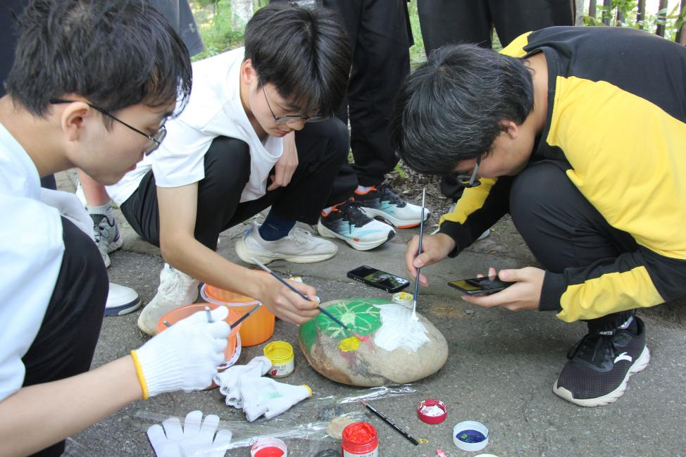 活动前期,两院员工分组结对,充分研讨,结合农耕文化,自选节气主题进行绘画设计。活动现场,小组成员们结合基地的实际地形和植物场景,进行了立春、春分、惊蛰、立夏、秋分等八个节气主题的石头手绘和园景设计。同学们在石头上活灵活现地展现了不同节气的万物生长状态,以“万物复苏,草长莺飞”来描绘春分时节,以“小麦饱满,江河渐满”来体现小满时节,以“三秋大忙,硕果累累”表达秋分时节……