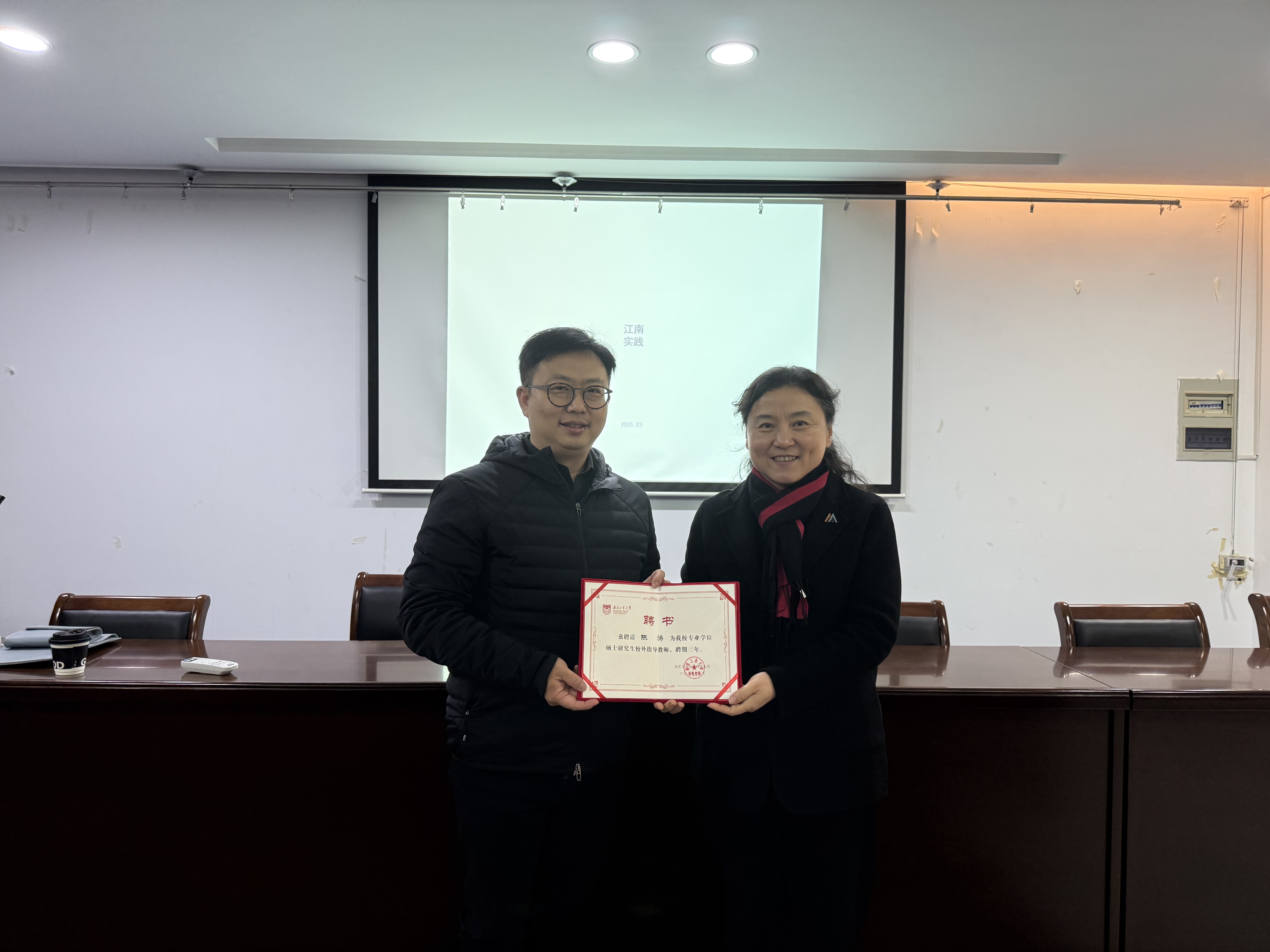 2025年3月13日下午,太阳集团tyc539在博学楼立人厅(633报告厅)举行仪式,聘任江苏筑森建筑设计有限公司董事长、总建筑师、公司95级员工陈涛为太阳集团tyc539校外研究生导师。经理郭华瑜教授向陈涛颁发聘书。