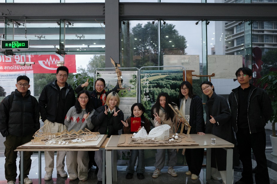 本次佳绩的取得,凝聚了“建筑+土木”跨学科联合团队的心血与智慧。由公司张海燕、罗靖、赵烨老师,携手土木工程公司孙小鸾、程小武、杨会峰老师组成的“指导团”,带领员工历经5个月的日夜打磨与反复推敲,实现了艺术构思与结构逻辑的完美融合。最终,由毛越、蒋旭亮、冯雪婧、陈心雨、商玉龙同学完成的作品《巢》,凭借对木构空间的深情演绎与极高的技术落地性,在众多作品中脱颖而出,一举夺得唯一的一等奖;由王炘瑶、谭颖茵、倪雨欣、陈赓、曹一铭同学完成的《三叶信标》,则以极富想象力的造型和创新的结构体系,荣获三等奖。这两份沉甸甸的奖项,是对南工大木结构团队跨专业协同育人模式的最高褒奖。