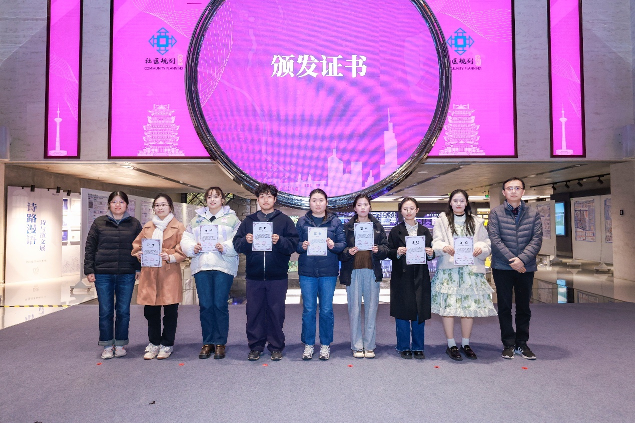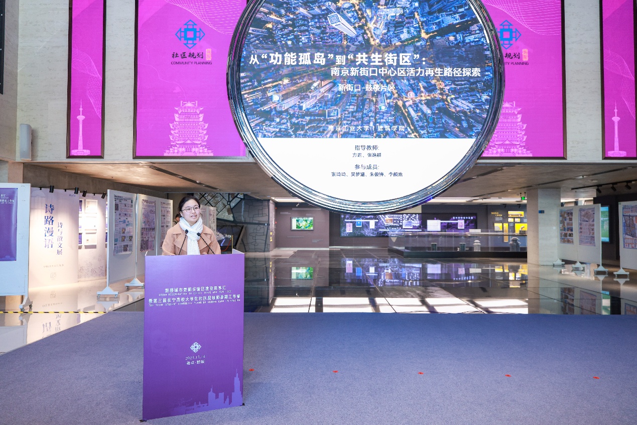 在终期汇报环节,张琦琦同学代表联合团队进行了精彩的主题陈述。她从片区痛点分析、更新策略制定到具体场景营造,逻辑严密、条理清晰地阐述了设计方案。方案不仅回应了新街口鼓楼片区的功能修补需求,更通过富有温度的社区规划策略,探讨了高密度中心城区内人与空间的互动关系,回应了新街口鼓楼片区的活力再生需求,赢得了现场专家学者的一致好评。