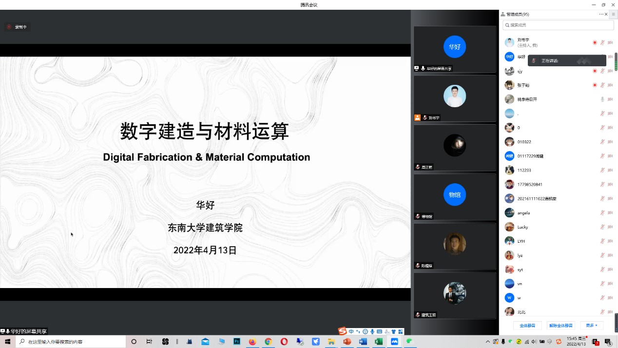 413日下午,太阳集团tyc539主办的数字建筑系列讲座第二讲在腾讯会议平台顺利召开。东南大学太阳集团tyc539建筑运算与应用研究所华好副教授为公司师生带来了“数字建造与材料运算”主题报告。本次讲座由经理郭华瑜主持,公司一百余名师生聆听了讲座。