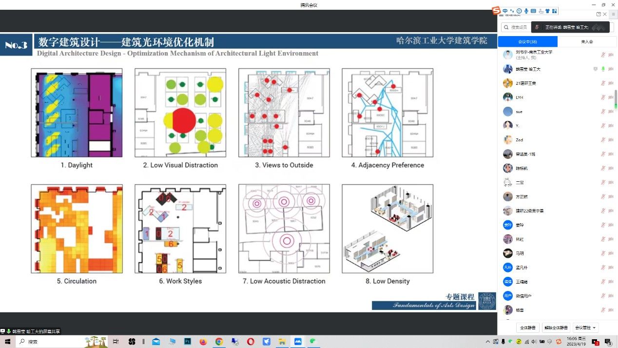 韩雪莹老师首先从绿色化、智能化的时代背景切入,深入论述了数字建筑设计的本质内涵。以此为基础,详细梳理了数字建筑设计从模拟数列计算、物理仿真分析一路走向交互过程模拟、算法生成设计的发展历程,并对Radiam、Daysim等数字建筑的关键技术进行了重点阐述。结合自身的科研课题,生动阐释了光环境参数、动态光源等建筑光环境领域的最新研究动态。通过对建筑光环境数字设计的系统性介绍,为同学们建立起了对这一领域的框架性认识,引领同学们更加深刻地理解建筑光环境与数字设计的交叉融合。