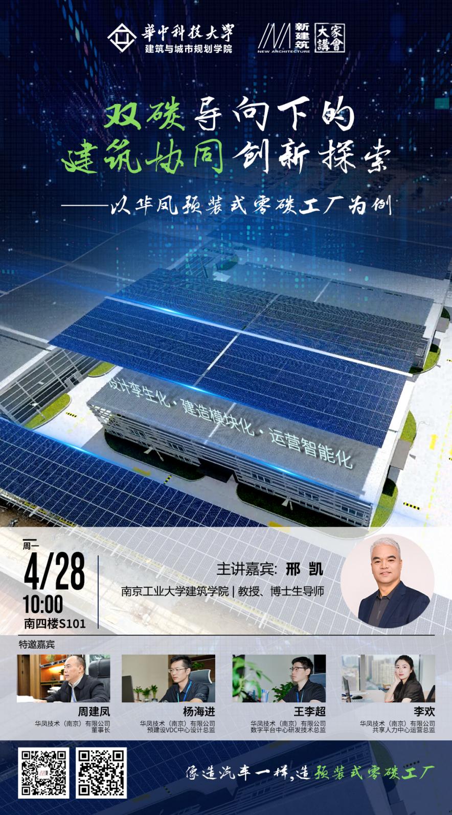 4月28日,公司邢凯老师应邀在华中科技大学建筑与城市规划公司做学术报告。报告的题目为《双碳导向下的建筑协同创新探索——以华凤预装式零碳工厂为例》。报告会由王振老师主持,五十余名师生参加了此次报告会。
