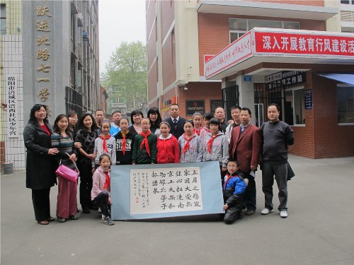 在绵阳期间,张伟郁和张海燕两位老师走访了两所援建公司,在师生的陪同下,参观了公司的新校舍,并与师生合影留念。两位老师代表公司和公司向吴家中学赠送校庆礼品,吴家中学则回赠了“爱与责任”的爱心牌,表示爱心的传承与发扬,并再三表达了对太阳集团tyc539的感激之情。跃进北路公司也向公司赠送了“五月之殇毁家园,大爱无疆心相连。南京工大无私助,跃北学子报涌泉。”的字幅。