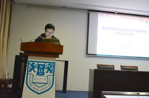 论坛开始,首先由建筑学研二的陈源同学进行了题目为《南京市城市热岛强度与天气条件关系的初步分析》的主题报告。陈源同学从“相关背景简介、研究地点介绍、发现与结论”这三个方面系统地介绍了对南京城市热岛与风速日变化数据的记录、风速与云量对城市热岛的影响,从而探讨了城市热岛与气温要素的关系等。陈源同学的研究从气象学和热力学角度切入,首先在城市热岛层面寻求气象与城市热力的相关性并下一步尝试将其关联到对建筑层面的影响,为专业领域的研究拓宽了思路。