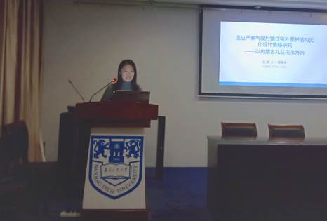 然后,建筑学研一的杨琳卓同学作了题为《适应严寒气候村镇住宅外围护结构优化设计策略研究—以内蒙古扎兰屯市为例》的学术汇报。以内蒙古扎兰屯市的村镇住宅为对象,以当地建筑节能设计标准为基础,结合严寒地区气候特点,从规划布局、建筑设计、构造设计着力,重点对建筑的外墙、外墙与门窗交接部位、屋顶设计中存在的问题及做法进行分析并提出优化设计方案;从低能耗的角度,优选可推广的节能技术措施。杨琳卓同学运用建筑学专业角度分析家乡的实际问题,体现了学以致用的精神。