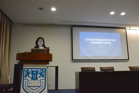 再次,风景园林研二的车伊同学以《应对城市热岛效应的体育公园步道景观微气候营造》为题与大家交流。通过案例学习和实证研究,以南京市两处城市体育公园为例,研究景观系统规划并分析微气候营造条件,指出了步道系统规划在城市公园景观塑造中的严重缺位,并提出适宜微气候营造的改造策略,对于南京市公园景观系统规划和微气候营造具有一定的借鉴意义。