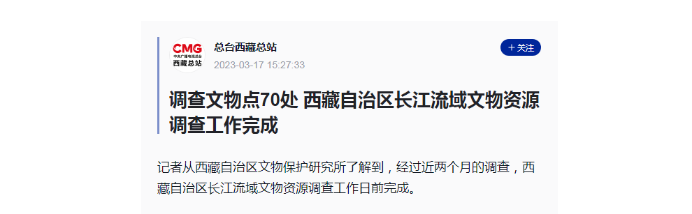 本次西藏自治区长江流域文物资源调查工作被央视报道。