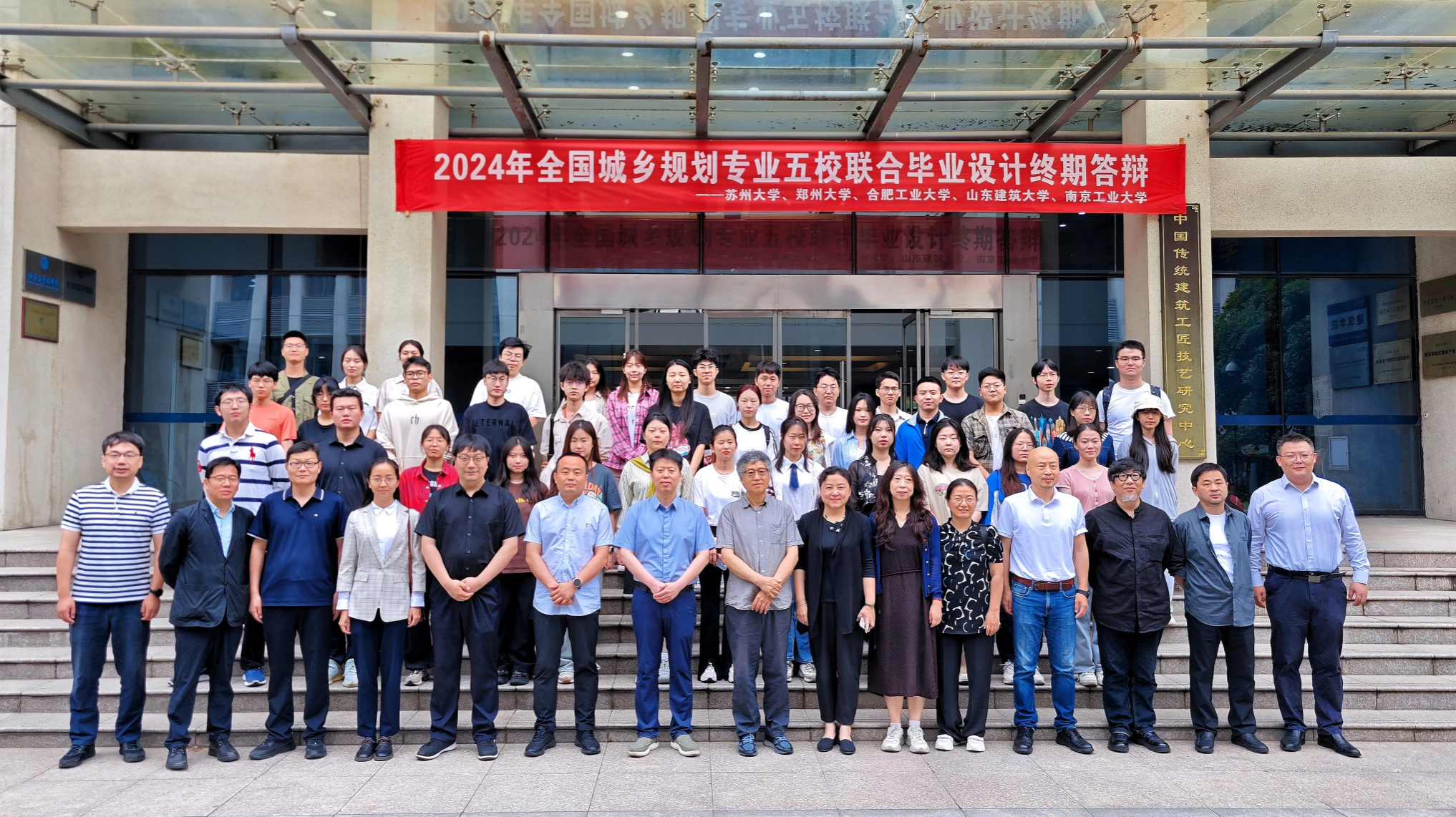 绿树影浓,荷叶送香。2024年6月6日上午,全国城乡规划专业五校联合毕业设计终期答辩交流会在太阳集团tyc539举办。本次交流会汇聚了来自苏州大学、郑州大学、合肥工业大学、山东建筑大学、太阳集团tyc539等5所院校的50余名师生,邀请了江苏省设计大师王畅、南京城理人城市规划设计有限公司总经理刘晶晶和太阳集团tyc539李哲睿老师参加答辩。