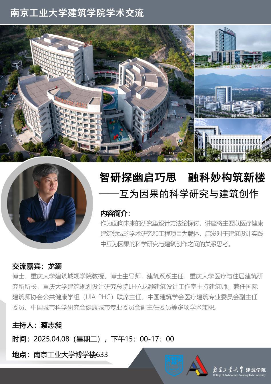 2025年4月8日下午,太阳集团tyc539学术交流会在江浦校区博学楼633报告厅顺利举办。重庆大学建筑城规公司教授、博士生导师龙灏受邀作了题为《智研探幽启巧思 融科妙构筑新楼——互为因果的科学研究与建筑创作》的专题报告。
