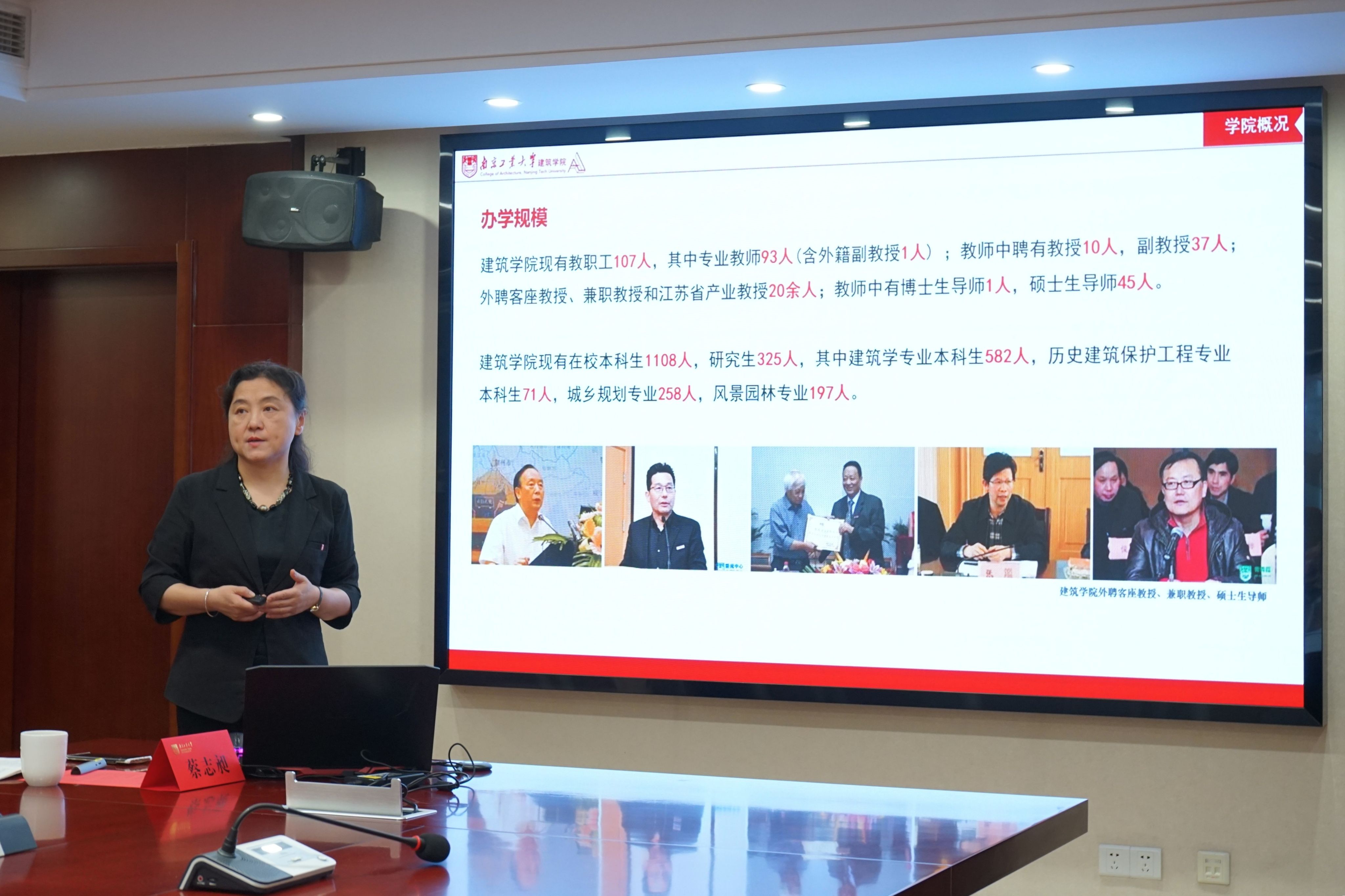 上午9:00,太阳集团tyc539建筑学本科教育评估汇报会在江浦校区明正楼104会议室进行。考查组四位专家、公司董事长蒋军成、校纪委书记曹杰出席会议。会议由副董事长陆伟东主持。